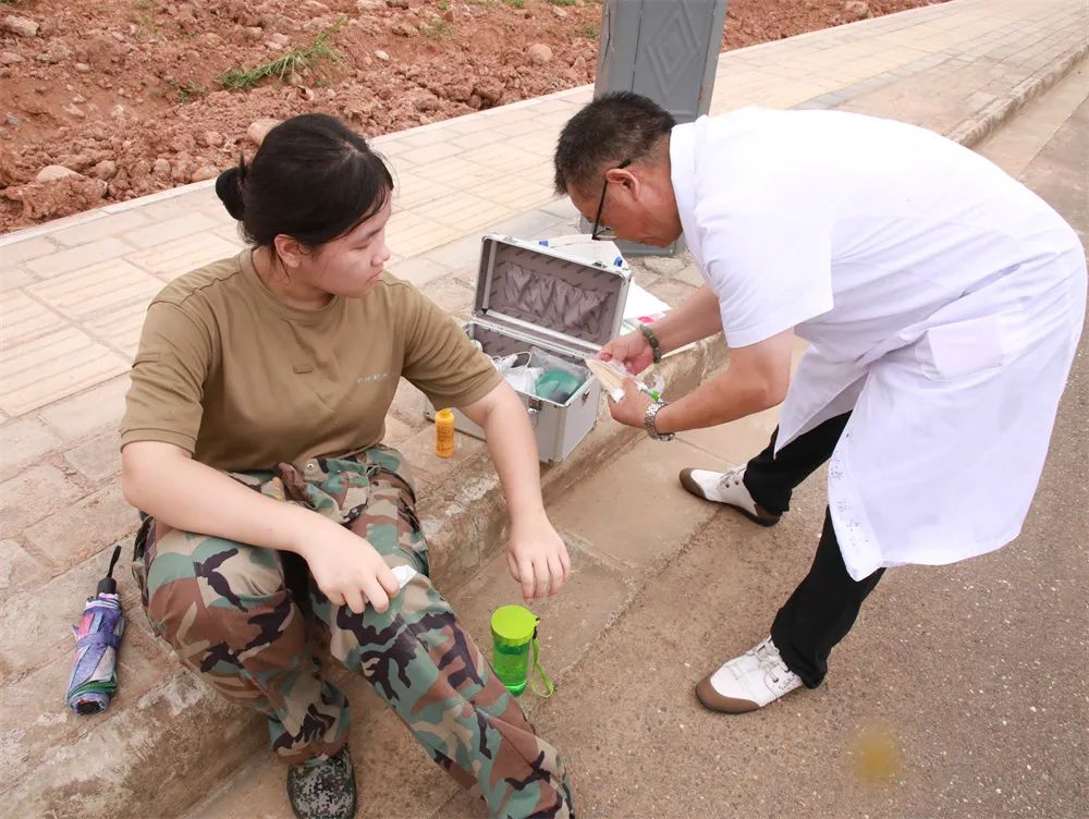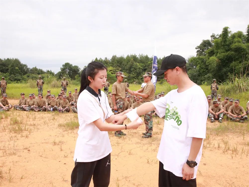 短暂休整🌳,同学们环形席地而坐,为后面的行程养精蓄锐。战地救护培训组老师适时进行战地紧急救护培训,讲授止血包扎🕘、环形包扎、螺旋包扎、螺旋反折包扎,踝关节扭伤固定包扎,四肢抽筋的处理方法等📌。