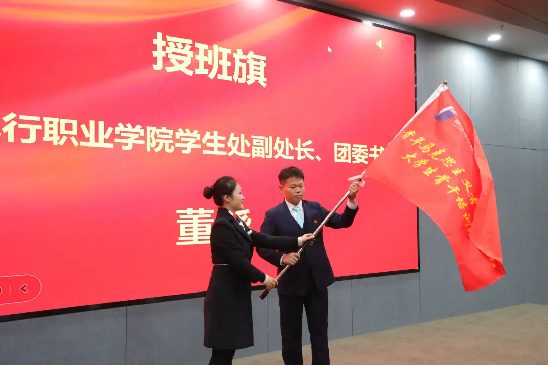 神彩app下载学生处副处长、团委书记董晓为2023-2024学年“青马工程”培训班授班旗。
