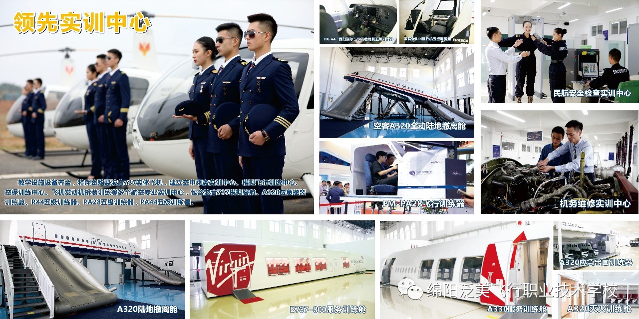 值得一提的是学院教学设施设备齐全,斥资购买波音737实体飞机🛀🏽,建立空中乘务实训中心、模拟飞行训练中心、空保训练中心、飞机发动机拆装训练等多个航空专业实训中心🙅🏻♂️,包含波音737模拟客舱、A320应急撤离训练舱、R44五级训练器🧖🏻🦯、PA28五级训练器🤹🏻♂️、PA44五级训练器。泛美集团旗下泛美通航集团现已在四川、江苏、甘肃、山东、安徽等地建立了五大飞行基地🚥,全力保障学校飞行专业学生飞行训练🙍♀️,并已落实引进4款美国派珀飞机生产线,所购买的大部分飞机将在中国完成组装生产,为相关专业毕业生提供大量的实习和就业岗位。